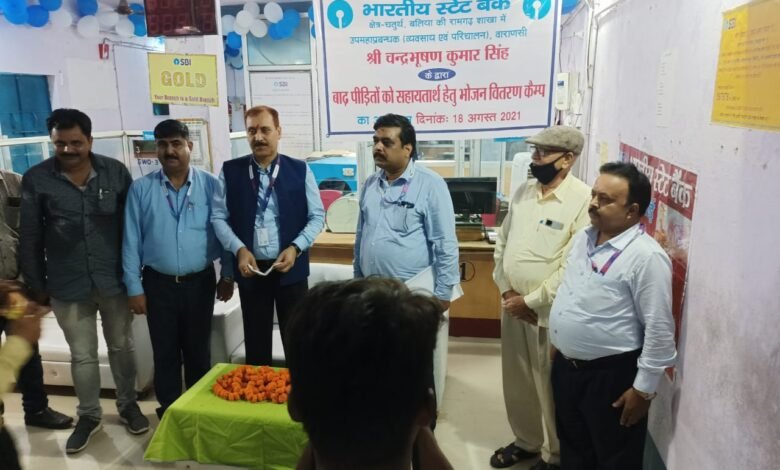 एसबीआई उप महाप्रबंधक चंद्र भूषण कुमार सिंह का बलिया प्रथम आगमन पर बैंक के सर्वेक्षण के बाद बाढ राहत सामग्री का किया वितरण